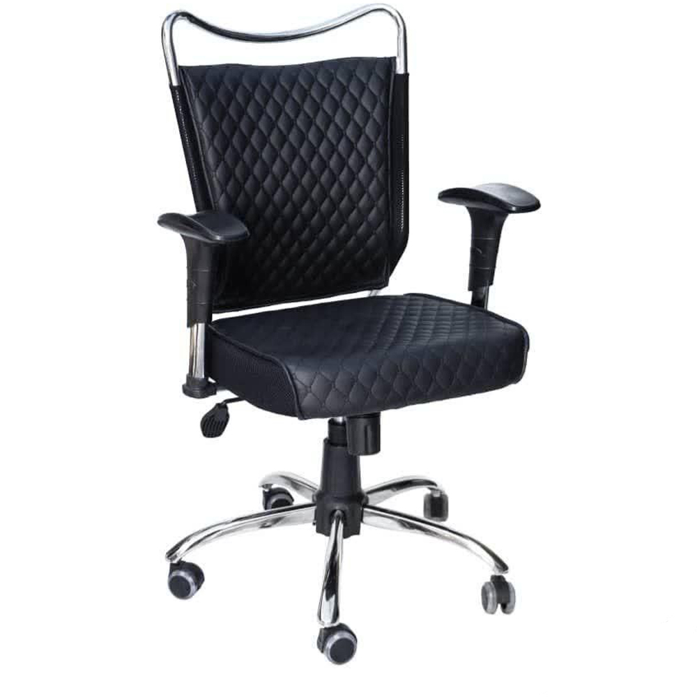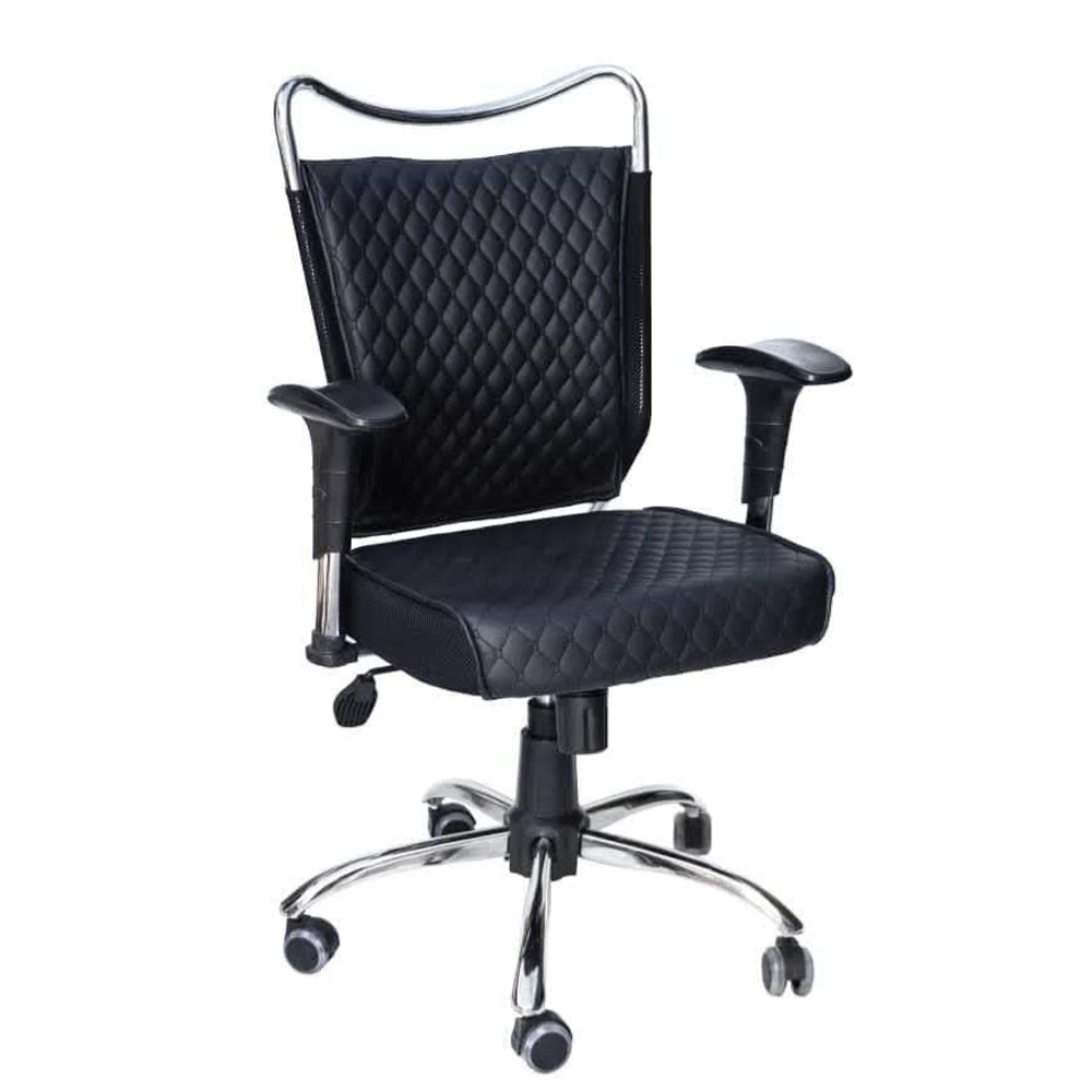 صندلی کارمندی با طراحی ارگونومیک، مکانیزم دو دسته قفلکن دار و روکش چرم ساده یا لوزیدوزی شده؛ مناسب فضای اداری مدرن.